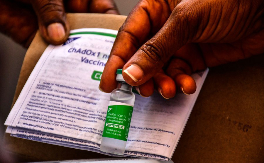 A dose of AstraZeneca COVID-19 vaccine is displayed during the launch of the COVID-19 vaccination campaign at Mulago Specialized Women and Neonatal Hospital in Kampala, Uganda, March 10, 2021. (Photo by Joseph Kiggundu/Xinhua)