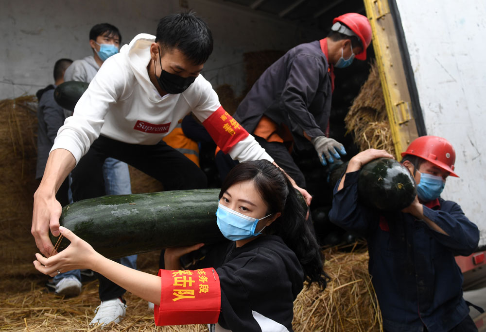 Young volunteers load vegetables during the pandemic last year at Nanning Railway Station, Guangxi Zhuang autonomous region, destined for Wuhan, Hubei province. LU BOAN/XINHUA