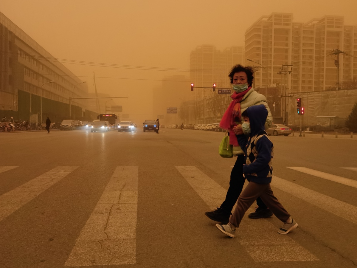 A woman and a child walk during a sandstorm in Beijing on March 15, 2021. [Photo by Wang Jing/chinadaily.com.cn]