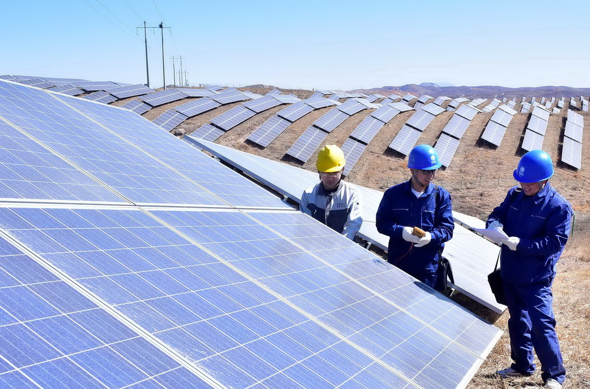 Workers check grid-connected facilities at a photovoltaic power plant in Shijiazhuang, Hebei province. JIA MINJIE/FOR CHINA DAILY
