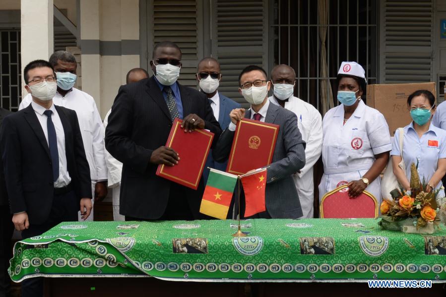 Hassan Ben Bachir (2nd L, Front), head of the cooperation division of Cameroonian Ministry of Public Health, and Guo Jianjun (1st R, Front), the economic and commercial counselor of the Chinese Embassy in Cameroon, pose for a photo during a handover ceremony of China-donated medical equipment in Yaounde, Cameroon, on March 15, 2021. The Yaounde Central Hospital, one of the largest designated hospitals for COVID-19 treatment in Cameroon, received a batch of medical equipment donated by China to fight against the novel coronavirus. (Xinhua/Qiao Benxiao)