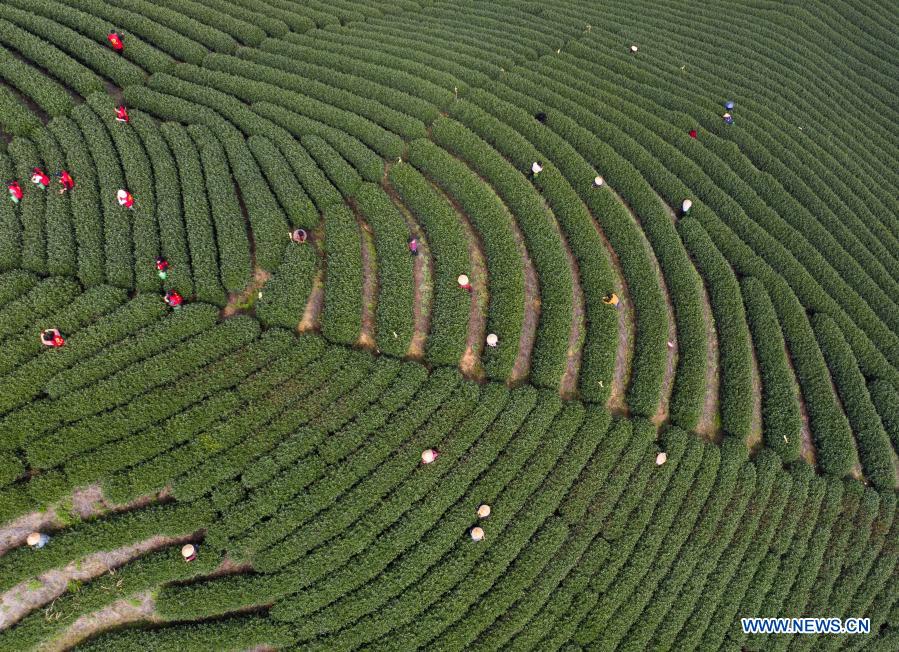 Aerial photo taken on March 15, 2021 shows volunteers and farmers picking tea leaves on a tea farm at Bashan Village, Fuyang District, Hangzhou of east China's Zhejiang Province. The vast tea farms have embarked harvest season as the temperature kept rising at Bashan Village. Volunteers of Fuchun Sub-district were organized into assistance groups to help pick tea leaves or to promote tea products via on-line live streaming on these tea farms. Best known for its Longjing Tea, Bashan Village reaped in an annual sales of more than 100 million yuan (about 15.38 million U.S. dollars) with its tea products in 2020. (Xinhua/Xu Yu)
