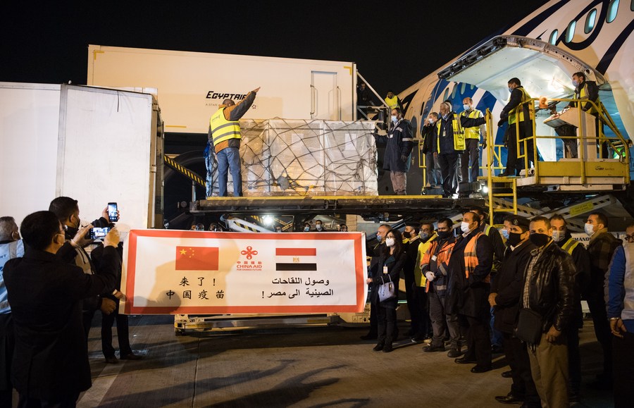 Workers upload a batch of China's Sinopharm COVID-19 vaccines onto a truck in Cairo International Airport, Egypt, Feb. 23, 2021. (Xinhua/Wu Huiwo)