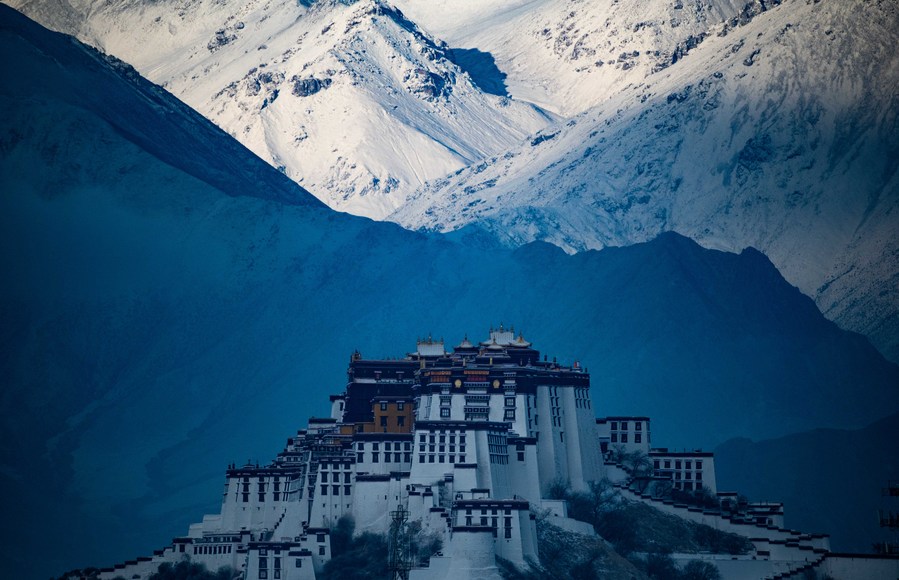 Photo taken on Feb. 11, 2021 shows snow scenery of the Potala Palace in Lhasa, southwest China's Tibet Autonomous Region. (Xinhua/Purbu Zhaxi)