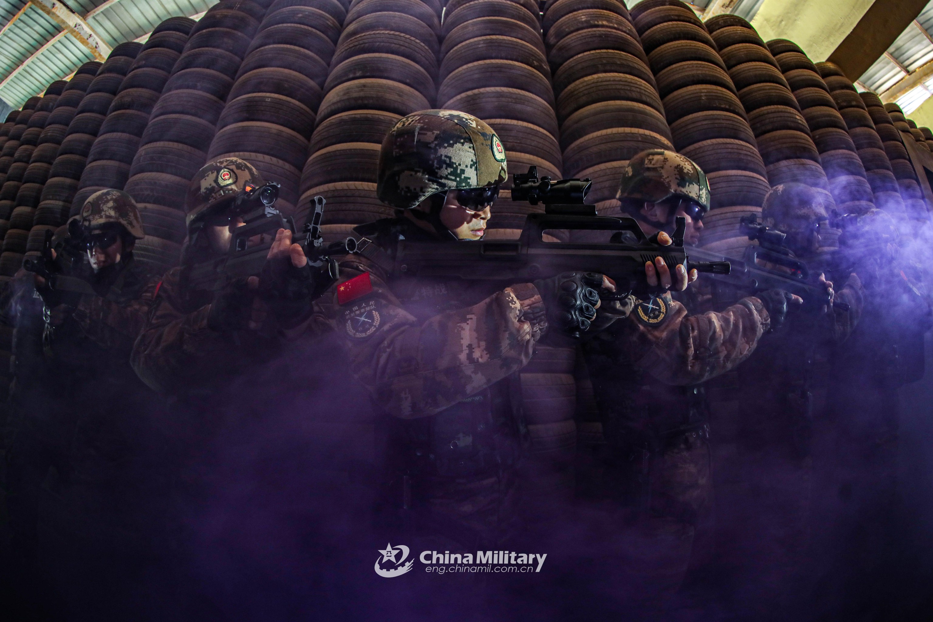 Special operations soldiers assigned to a detachment under the Chinese People’s Armed Police (PAP) Force Tianjin Contingent advance and reconnoiter with aimed rifles in assault group during the comprehensive counter-hijacking training on March 4, 2021. (eng.chinamil.com.cn/Photo by Qian Zhiqiang)