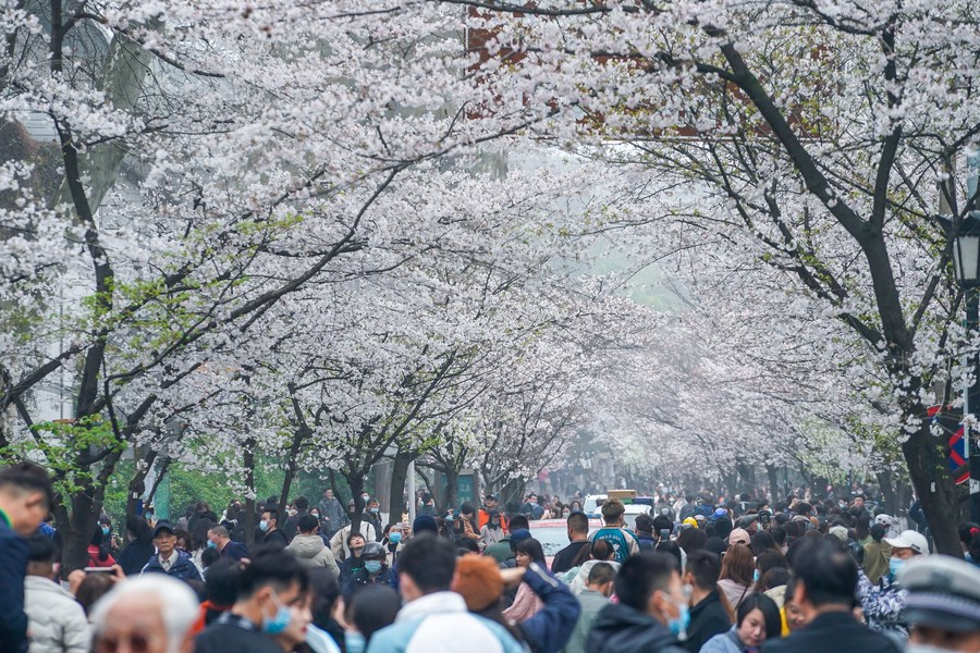 Tourists view cherry blossoms at Jimingsi Road in Nanjing, east China's Jiangsu Province, March 16, 2021. Cherry blossoms in Nanjing are in full bloom recently. (Xinhua/Li Bo)