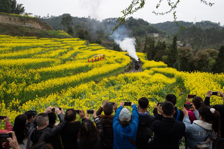 Tourists take photos of a train running through cole flower fields in Qianwei County, southwest China's Sichuan Province, March 2, 2021. (Xinhua/Liu Mengqi)