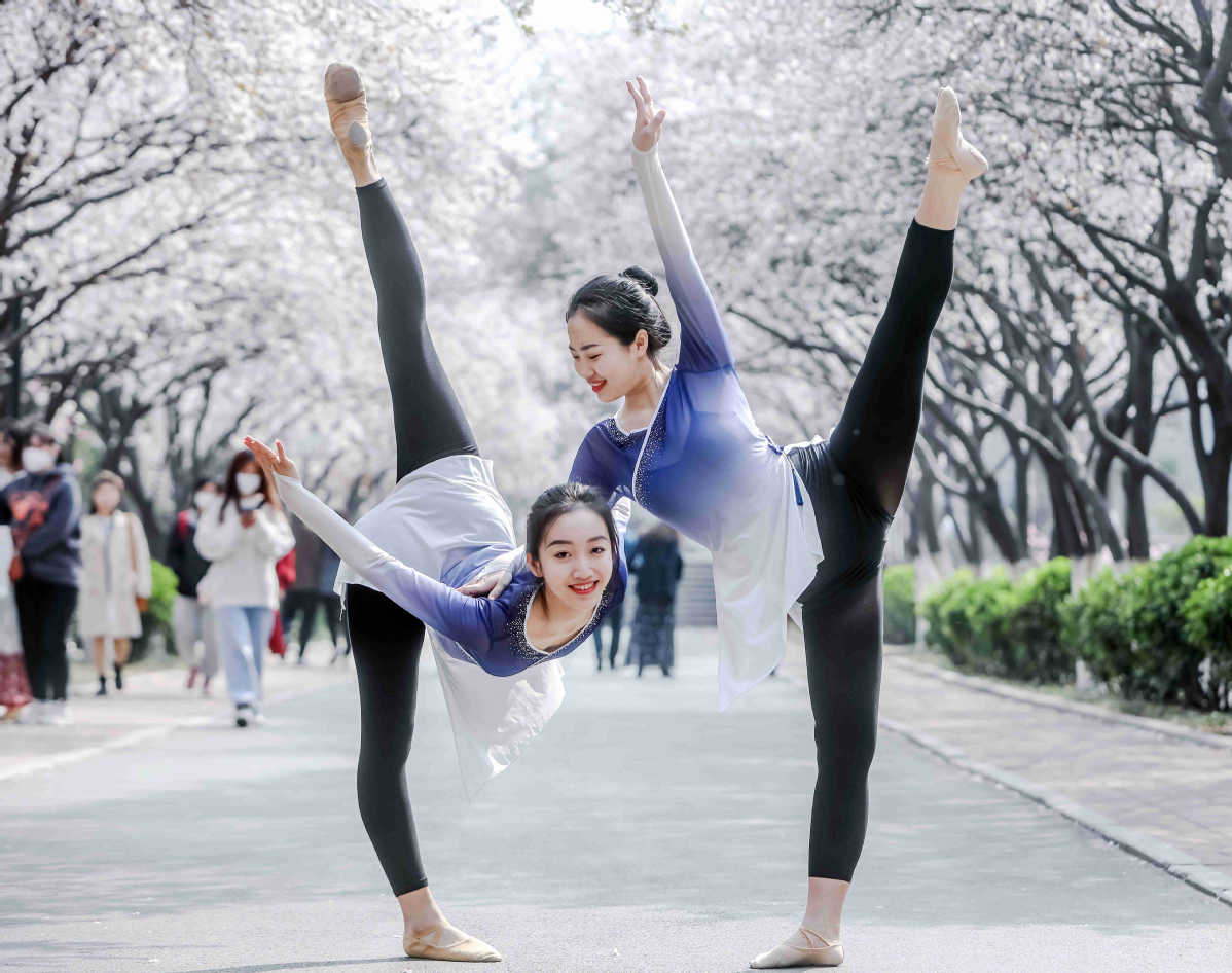 A group of students are seen dancing at the Qianfo Mountain Campus of Shandong Normal University in Jinan, East China's Shandong province against a backdrop of various blooming flowers. [Photo provided to chinadaily.com.cn]