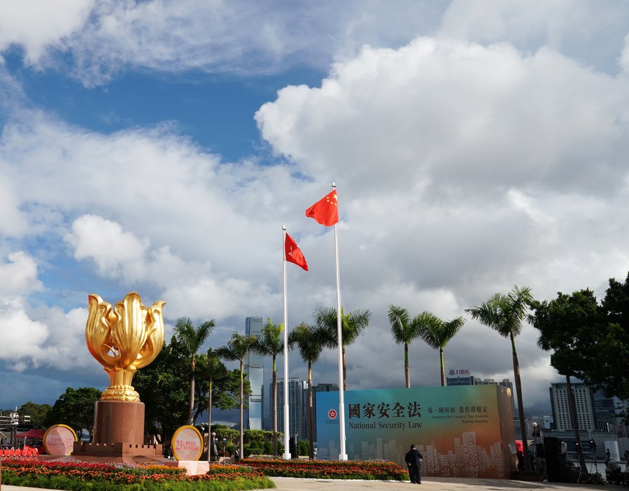 Photo taken on July 1, 2020 shows the iconic Golden Bauhinia Square in Hong Kong, China. (Xinhua/Li Gang)