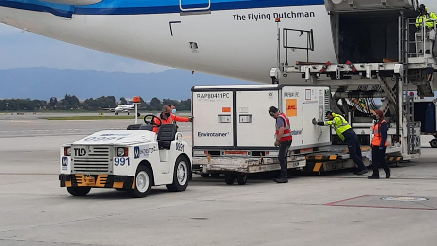 A batch of COVID-19 vaccines produced by Chinese biopharmaceutical company Sinovac Biotech Ltd. arrive in Bogota, capital of Colombia, Feb. 20, 2021. (Photo/Official website of the embassy of China in Colombia)