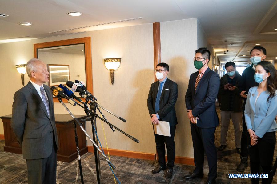 Chinese Ambassador to the United States Cui Tiankai (L) speaks during a joint interview with Chinese media in Anchorage, Alaska, the United States, March 17, 2021. (Xinhua/Liu Jie)