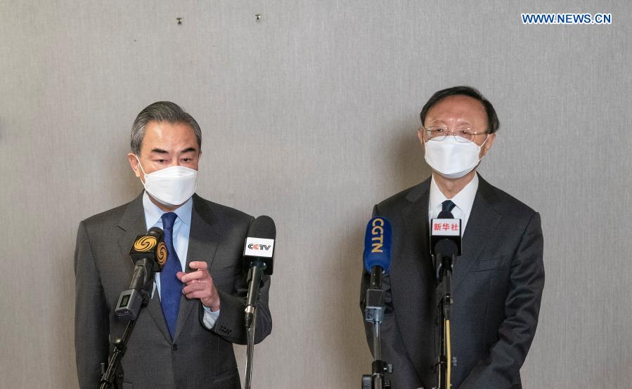 Yang Jiechi, a member of the Political Bureau of the Communist Party of China (CPC) Central Committee and director of the Office of the Foreign Affairs Commission of the CPC Central Committee, and Chinese State Councilor and Foreign Minister Wang Yi receive an interview with media following the end of the high-level strategic dialogue with the United States in the Alaskan city of Anchorage on March 19, 2021. (Xinhua/Liu Jie)
