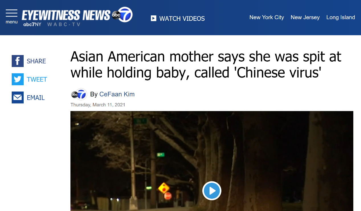 A screenshot of the website of an ABC local news channel shows the reporting of a hate crime in which an Asian mom was spit at while holding her baby and called “Chinese virus” in Queens, New York City on March 11.