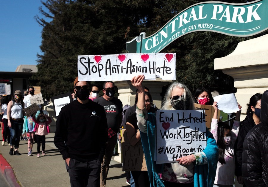 People take part in a rally against anti-Asian hate crimes in San Mateo, California, the United States, on Feb. 27, 2021. (Xinhua/Wu Xiaoling)