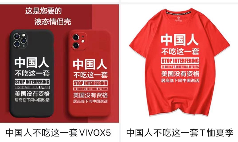 T-shirts and mobile phone cases bearing slogans such as "Chinese people don't buy it", "Stop interfering in China's internal affairs" and "the US does not have the qualification to speak to us in a condescending manner," appeared on the shelves of Chinese e-commerce platforms like Taobao and Pinduoduo.