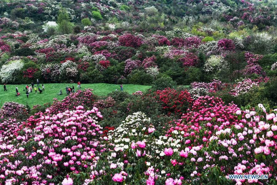 Tourists view azalea flowers at Pudi scenic spot in Bijie City, southwest China's Guizhou Province, March 21, 2021. Over 120 square kilometers of azalea flowers here have entered blooming season recently, attracting many people to visit. (Xinhua/Yang Wenbin)