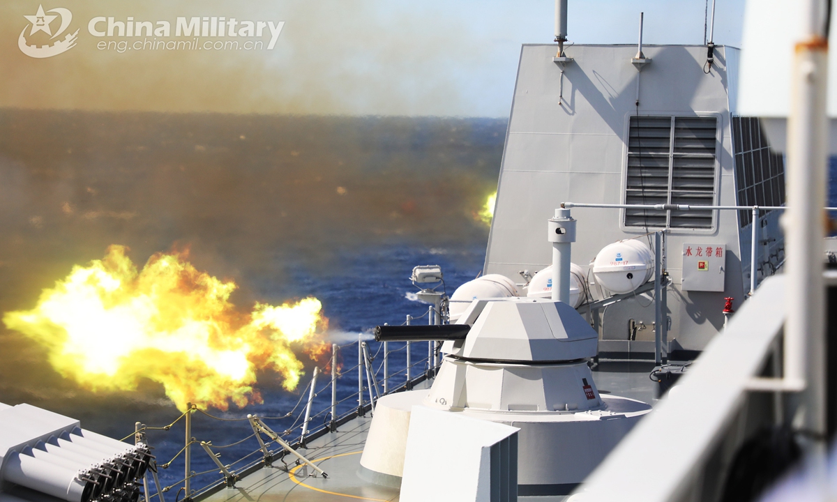 The close-in weapon system of the amphibious dock landing ship Wuzhishan(Hull 987) fires at the mock target at sea during the actual combat training organized by a naval landing ship flotilla under the PLA Southern Theater Command in late February, 2021. Photo:China Military