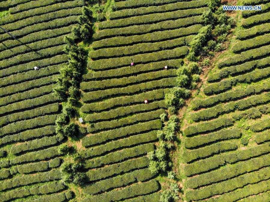 Aerial photo taken on March 24, 2021 shows villagers pick tea leaves at a tea base in Zhuchang Town of Bijie City, southwest China's Guizhou Province. (Photo by Han Xianpu/Xinhua)