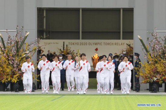 Iwashimizu Azusa (C) and other members of "Nadeshiko Japan", the Japan women's National Football Team, run as torchbearers in the first leg of the torch relay for Tokyo Olympic Games at J-Village National Training Center in Futaba, Fukushima of Japan, on March 25, 2021. (Xinhua/Du Xiaoyi)