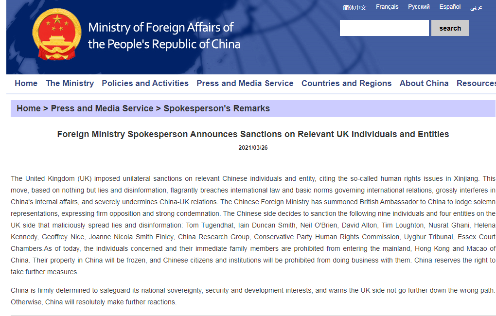 According to a statement by a Chinese Foreign Ministry spokesperson, the United Kingdom (UK) imposed unilateral sanctions on relevant Chinese individuals and entity, citing the so-called human rights issues in Xinjiang.