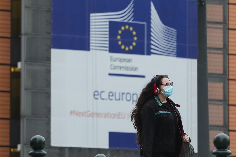 A woman walks past the European Commission Headquarters in Brussels, Belgium, Oct. 30, 2020. (Xinhua/Zheng Huansong)