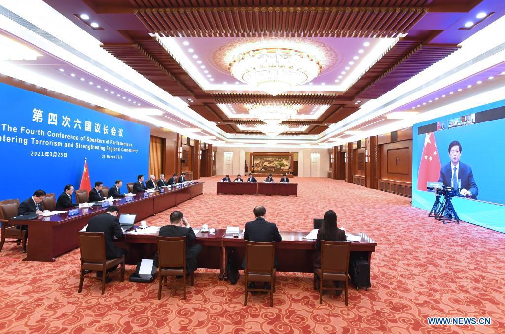 Li Zhanshu, a member of the Standing Committee of the Political Bureau of the Communist Party of China Central Committee and chairman of the National People's Congress Standing Committee, delivers a speech at the Fourth Conference of Speakers of Parliaments on Countering Terrorism and Strengthening Regional Connectivity via video link in Beijing, capital of China, March 25, 2021. (Xinhua/Rao Aimin)