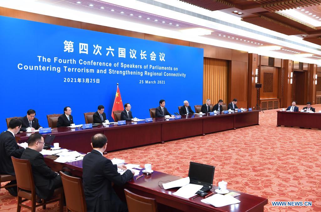 Li Zhanshu, a member of the Standing Committee of the Political Bureau of the Communist Party of China Central Committee and chairman of the National People's Congress Standing Committee, delivers a speech at the Fourth Conference of Speakers of Parliaments on Countering Terrorism and Strengthening Regional Connectivity via video link in Beijing, capital of China, March 25, 2021. (Xinhua/Rao Aimin)