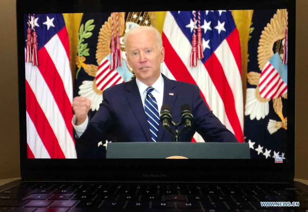 Photo taken in Arlington, Virginia, the United States, on March 25, 2021 shows a screen displaying U.S. President Joe Biden speaking during a press conference in Washington, D.C., in a live stream provided by Fox News. Biden held on Thursday his first formal press conference since taking office. (Xinhua/Liu Jie)