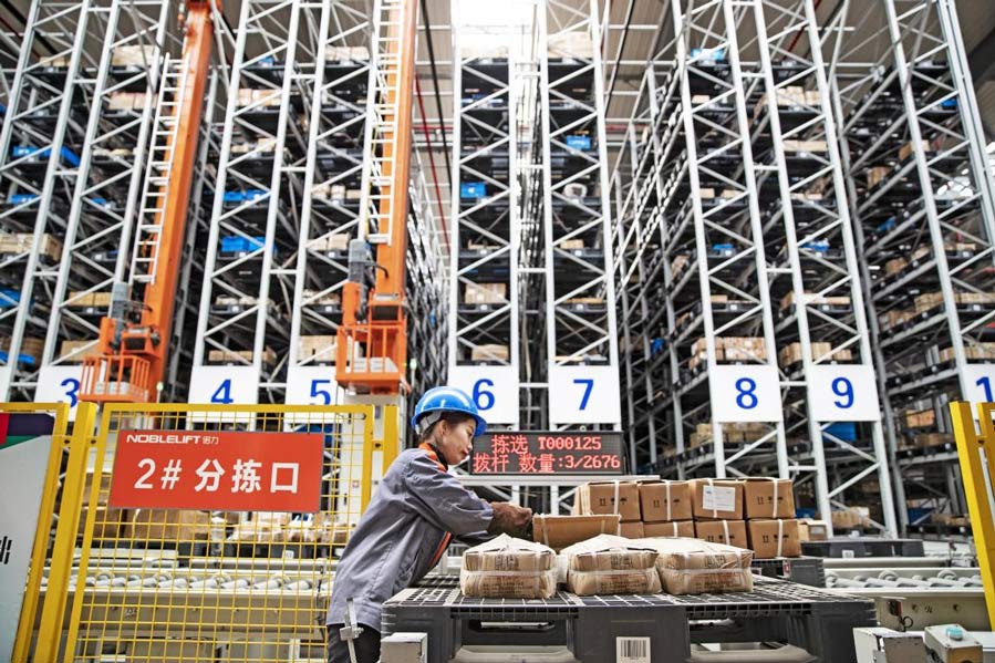 A worker sorts cargos before 5G-based intelligent warehouse racks at a smart factory of Noblelift Intelligent Equipment Co., Ltd., Changxing County, Huzhou, east China's Zhejiang Province, Feb. 2, 2021. (People's Daily Online/Wang Jinyan)