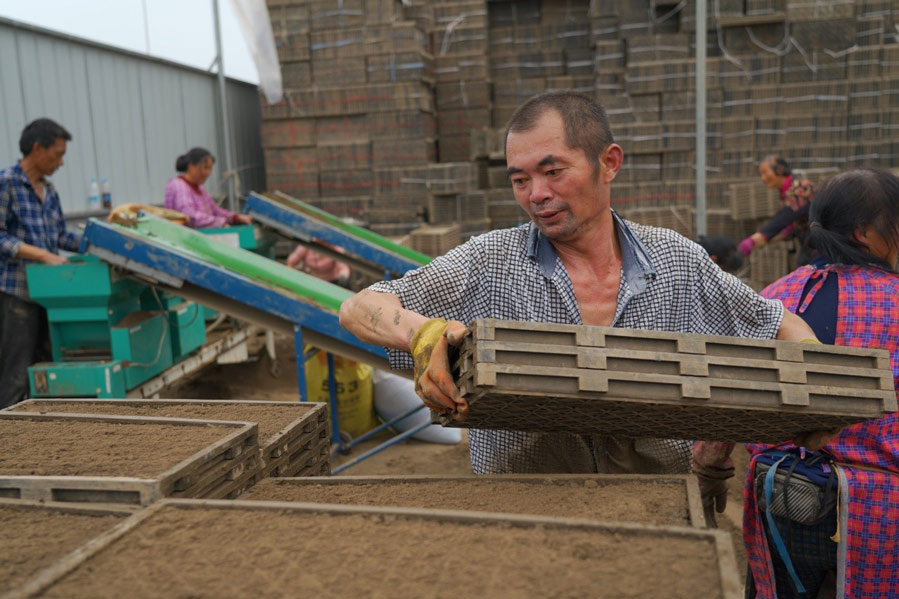 On a sunny and warm day of mid-March, Wang Chenglin was working with his fellow workers for sprout cultivation as spring farming kicked off in his hometown Jinzhu village, Pengshan District, Meishan, southwest China's Sichuan Province.