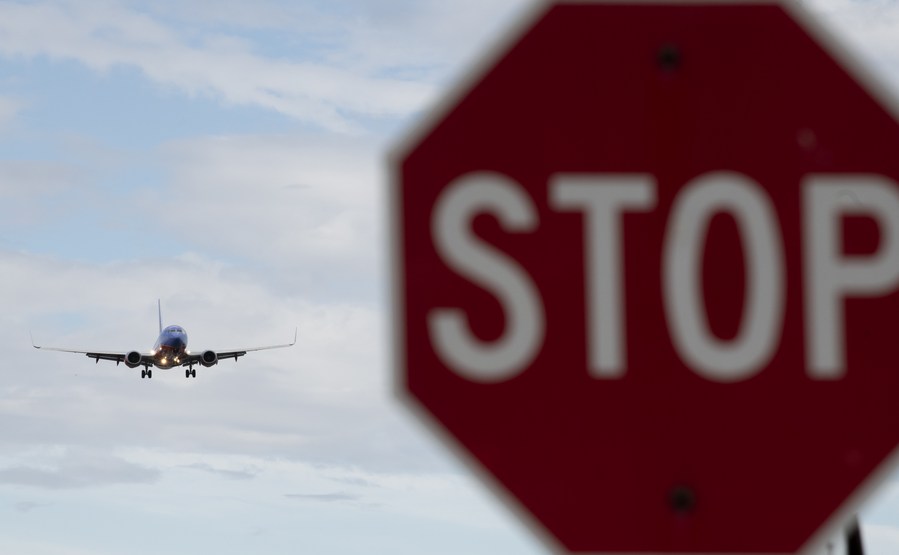 Photo taken on March 10, 2020 shows a stop sign and a plane approaching to land at Ronald Reagan Washington National Airport in Arlington, Virginia, the United States. (Xinhua/Liu Jie)
