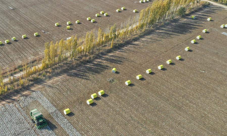 Aerial photo taken on Oct. 17, 2020 shows a machine harvesting cotton in a field in Wenjiazhuang Village, Manasi County of northwest China's Xinjiang Uygur Autonomous Region. (Xinhua/Ding Lei)