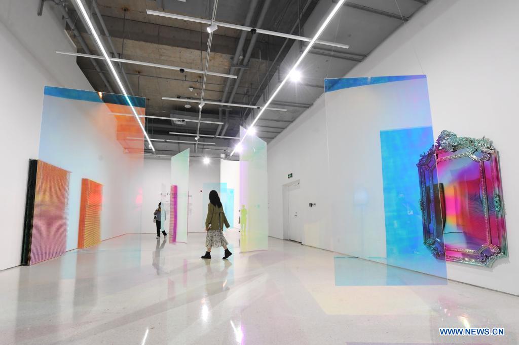Visitors view an artwork during the contemporary art show "WAVELENGTH: AT THE MOMENT" at Beijing Times Art Museum in Beijing, capital of China, March 27, 2021. The contemporary art show "WAVELENGTH: AT THE MOMENT" kicked off on Saturday and will last until June 14, 2021, featuring artworks from 18 artists from China and abroad. (Xinhua/Ren Chao)