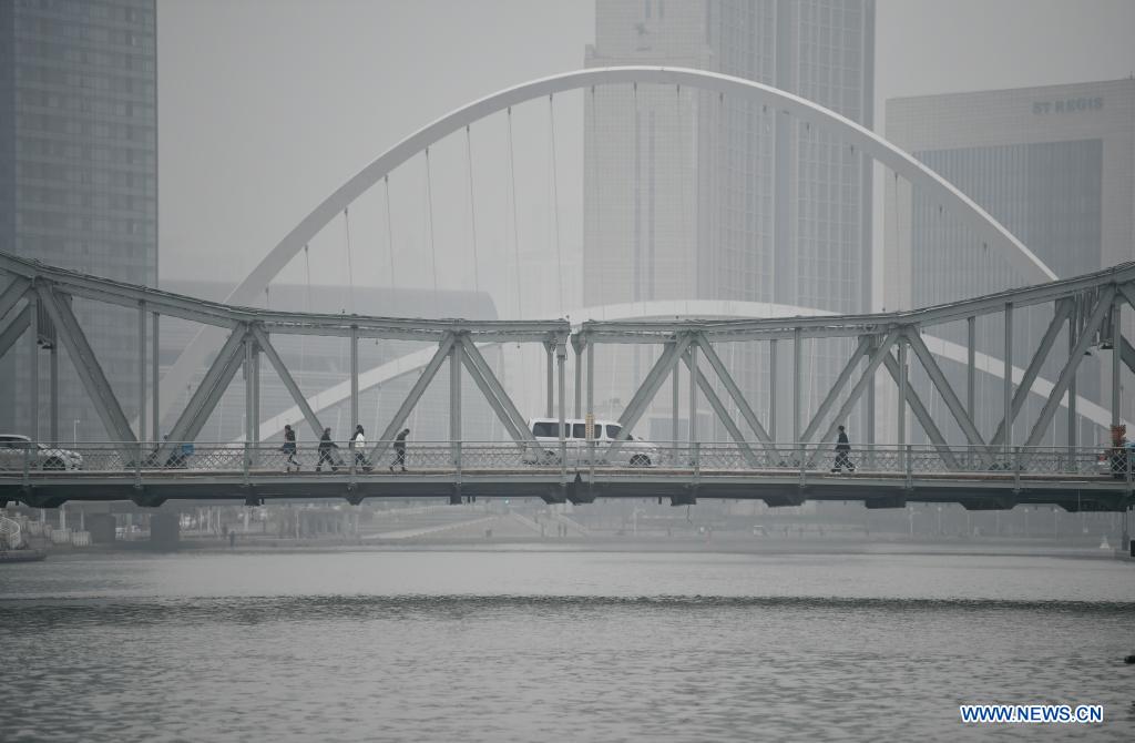 Photo taken on March 27, 2021 shows people and vehicles crossing a bridge amid fog in Tianjin, north China. (Xinhua/Sun Fanyue)