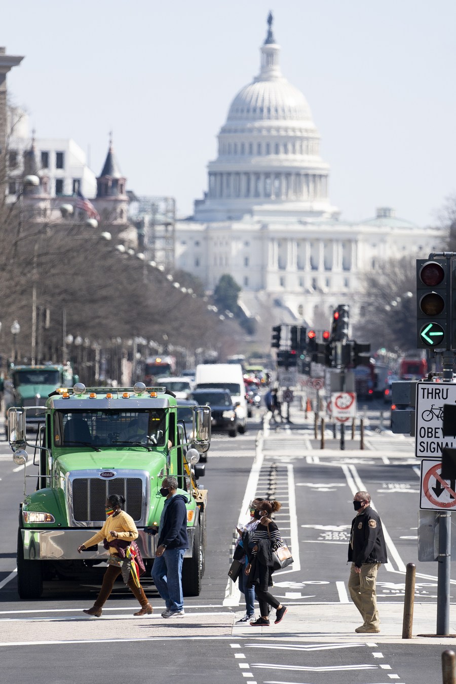 People walk across a street backdropped by the U.S. Capitol building in Washington, D.C., the United States, on March 10, 2021. (Xinhua/Liu Jie)