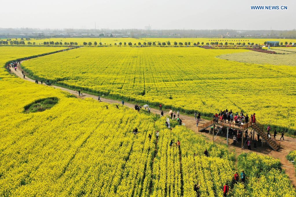 Aerial photo take on March 28, 2021 shows people viewing cole flowers in Baofeng County, central China's Henan Province. (Photo by He Wuchang/Xinhua)