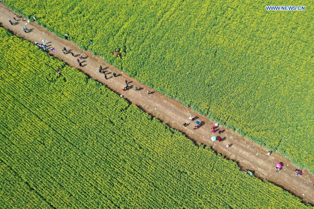 Aerial photo take on March 28, 2021 shows people viewing cole flowers in Baofeng County, central China's Henan Province. (Photo by He Wuchang/Xinhua)