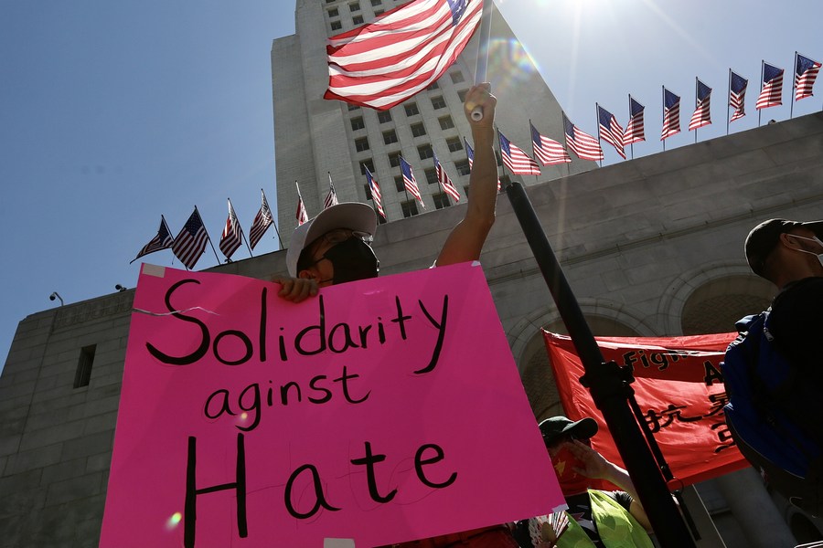 People participate in a Stop Asian Hate rally and march in response to the rising violence against Asian American communities at Los Angeles City Hall, California, the United States March 27, 2021. (Xinhua)
