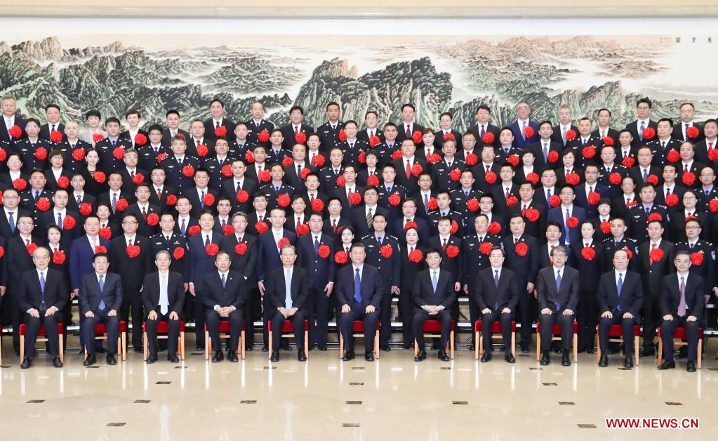Chinese President Xi Jinping, also general secretary of the Communist Party of China (CPC) Central Committee and chairman of the Central Military Commission, poses for a group photo with representatives of those honored for their outstanding work in China's campaign to fight organized and gang-related crimes in Beijing, capital of China, March 29, 2021. Wang Huning and Zhao Leji, both members of the Standing Committee of the Political Bureau of the CPC Central Committee, were present at the event. (Xinhua/Huang Jingwen)
