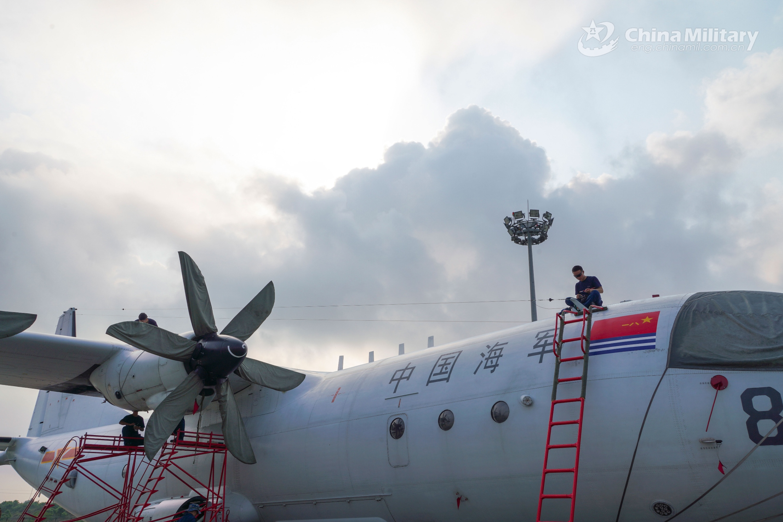 Maintenance men assigned to an aviation regiment of the navy under the PLA Southern Theater Command perform last-minute inspections on an anti-submarine patrol aircraft before an anti-submarine training exercise on March 15, 2021. (eng.chinamil.com.cn/Photo by Qin Qiangjiang)
