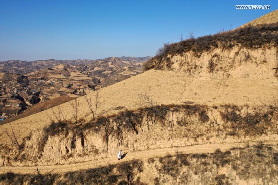 Aerial photo taken on March 23, 2021 shows Zhang Shangbao walking along a path for home visits in Tietou Village of Shilou County, north China's Shanxi Province. Zhang, 61, who has only one hand, has been walking through the mountains day after day since 1976, safeguarding the health of the locals. There are more than 600 villagers living in 5 hamlets of Tietou Village tucked away in the Lyuliang Mountains. In the past, it was difficult to access healthcare, which had plagued the masses here for a long time. In 1976, Zhang Shangbao graduated from a health school at the age of 16 and returned to his hometown to work as a village doctor. From then on, Zhang started his life staying on call around the clock to see patients. Unfortunately, Zhang lost his right hand in an accident when he was 35. With the tenacity of not bowing to fate, he quickly mastered the skills of living on his own. Through repeated practice, Zhang also learned how to inject fluids, vaccinate and fill in health records with his left hand. Last April, Zhang Shangbao reached retirement age, but he chose to continue with his work. "As long as the villagers need me," He said, "I will stick to my post." (Xinhua/Zhan Yan)
