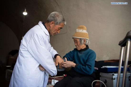 Zhang Shangbao (L) measures the blood pressure of a villager in Tietou Village of Shilou County, north China's Shanxi Province, March 23, 2021. Zhang, 61, who has only one hand, has been walking through the mountains day after day since 1976, safeguarding the health of the locals. There are more than 600 villagers living in 5 hamlets of Tietou Village tucked away in the Lyuliang Mountains. In the past, it was difficult to access healthcare, which had plagued the masses here for a long time. In 1976, Zhang Shangbao graduated from a health school at the age of 16 and returned to his hometown to work as a village doctor. From then on, Zhang started his life staying on call around the clock to see patients. Unfortunately, Zhang lost his right hand in an accident when he was 35. With the tenacity of not bowing to fate, he quickly mastered the skills of living on his own. Through repeated practice, Zhang also learned how to inject fluids, vaccinate and fill in health records with his left hand. Last April, Zhang Shangbao reached retirement age, but he chose to continue with his work. "As long as the villagers need me," He said, "I will stick to my post." (Xinhua/Yang Chenguang)
