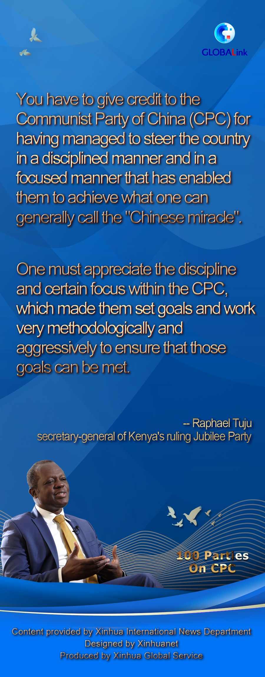 "You have to give credit to the Communist Party of China (CPC) for having managed to steer the country in a disciplined manner and in a focused manner that has enabled them to achieve what one can generally call the 'Chinese miracle'," Raphael Tuju, secretary-general of Kenya's ruling Jubilee Party, told Xinhua in a recent interview.