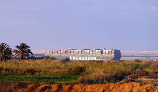 Photo taken on March 29, 2021 shows the container ship Ever Given moving on the Suez Canal, Egypt. The traffic in Suez Canal resumed after massive container ship Ever Given has been successfully refloated as being stranded in the canal for almost a week, Egypt's Suez Canal Authority (SCA) said on Monday. (Xinhua/Sui Xiankai)