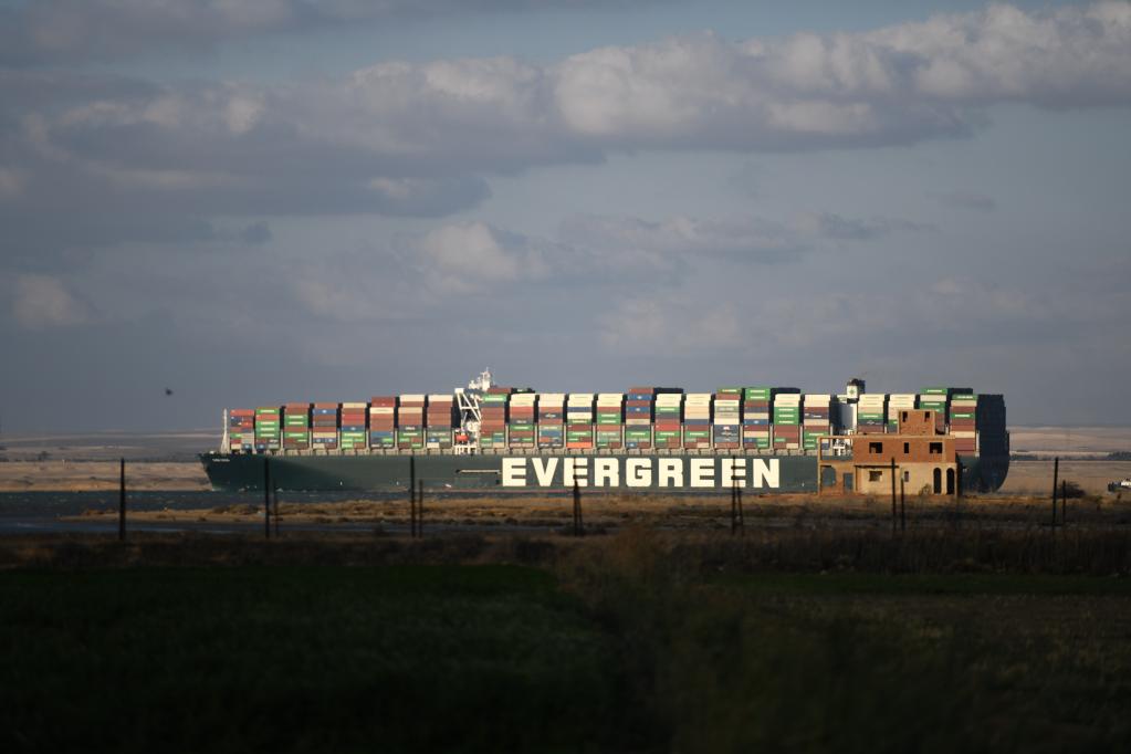 Photo taken on March 29, 2021 shows the container ship Ever Given moving on the Suez Canal, Egypt. The traffic in Suez Canal resumed after massive container ship Ever Given has been successfully refloated as being stranded in the canal for almost a week, Egypt's Suez Canal Authority (SCA) said on Monday. (Xinhua/Wu Huiwo)