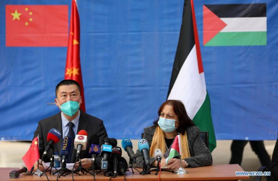 Director of the Office of the People's Republic of China to the State of Palestine Guo Wei (L) and Palestinian Health Minister Mai al-Kaila attend a handover ceremony of Sinopharm COVID-19 vaccines in the West Bank city of Ramallah, on March 29, 2021. China on Monday handed over a batch of donated Sinopharm COVID-19 vaccines to Palestine to support its nationwide fight against the pandemic. (Photo by Ayman Nobani/Xinhua)