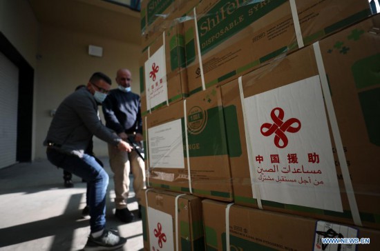 Workers transfer Sinopharm COVID-19 vaccines in Salem village, east of the West Bank city of Nablus, March 29, 2021. China on Monday handed over a batch of donated Sinopharm COVID-19 vaccines to Palestine to support its nationwide fight against the pandemic. (Photo by Ayman Nobani/Xinhua)