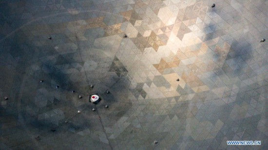 Aerial photo taken on March 28, 2021 shows China's Five-hundred-meter Aperture Spherical radio Telescope (FAST) under maintenance in southwest China's Guizhou Province. FAST has identified over 300 pulsars so far. Located in a naturally deep and round karst depression in southwest China's Guizhou Province, it officially began operating on Jan. 11, 2020. (Xinhua/Ou Dongqu)