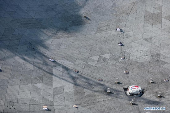 Photo taken on March 29, 2021 shows China's Five-hundred-meter Aperture Spherical radio Telescope (FAST) under maintenance in southwest China's Guizhou Province. FAST has identified over 300 pulsars so far. Located in a naturally deep and round karst depression in southwest China's Guizhou Province, it officially began operating on Jan. 11, 2020. (Xinhua/Ou Dongqu)