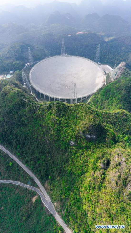 Aerial photo taken on March 28, 2021 shows China's Five-hundred-meter Aperture Spherical radio Telescope (FAST) under maintenance in southwest China's Guizhou Province. FAST has identified over 300 pulsars so far. Located in a naturally deep and round karst depression in southwest China's Guizhou Province, it officially began operating on Jan. 11, 2020. (Xinhua/Ou Dongqu)